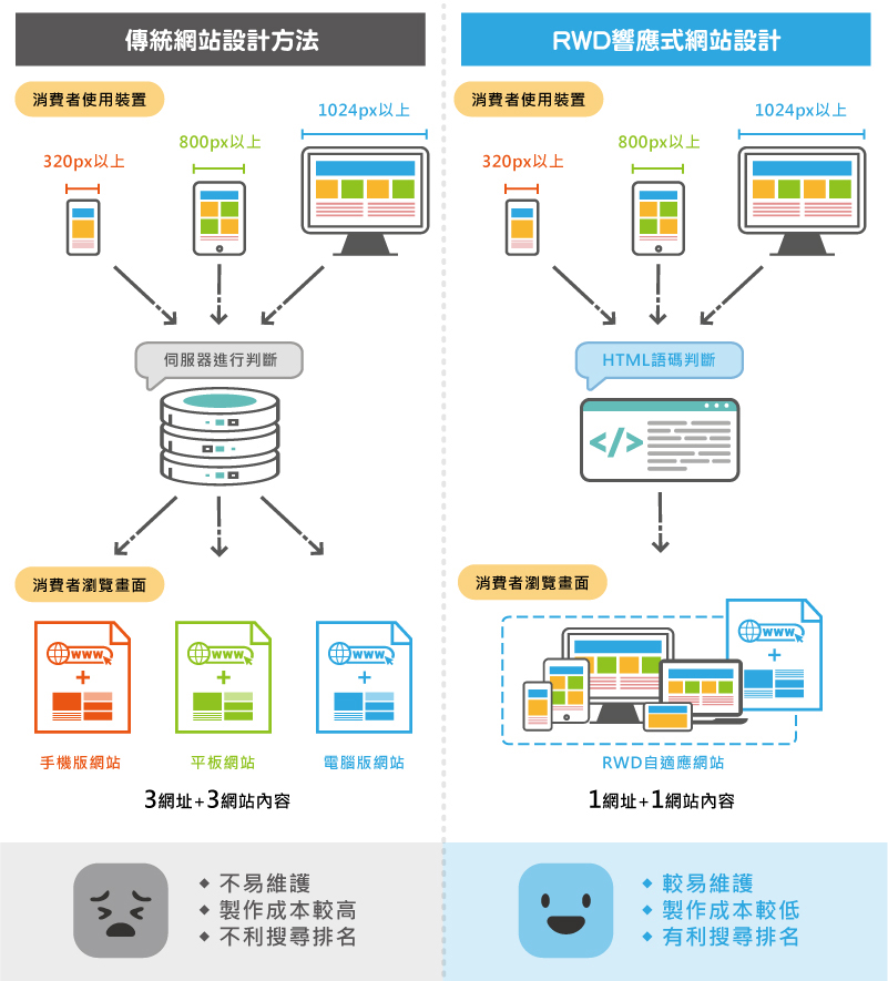 傳統型網站在電腦版好閱讀但手機板是等比縮不易閱讀,如果真的要用手機版或平板用網站就必須而外切版針對手機版或平板用網站製作,一旦要維護需同時修改個頁面,像教於傳統網站響應式網站可兼顧電腦、平版、手機等介面好閱讀,也比較符合顯在使用者需求。